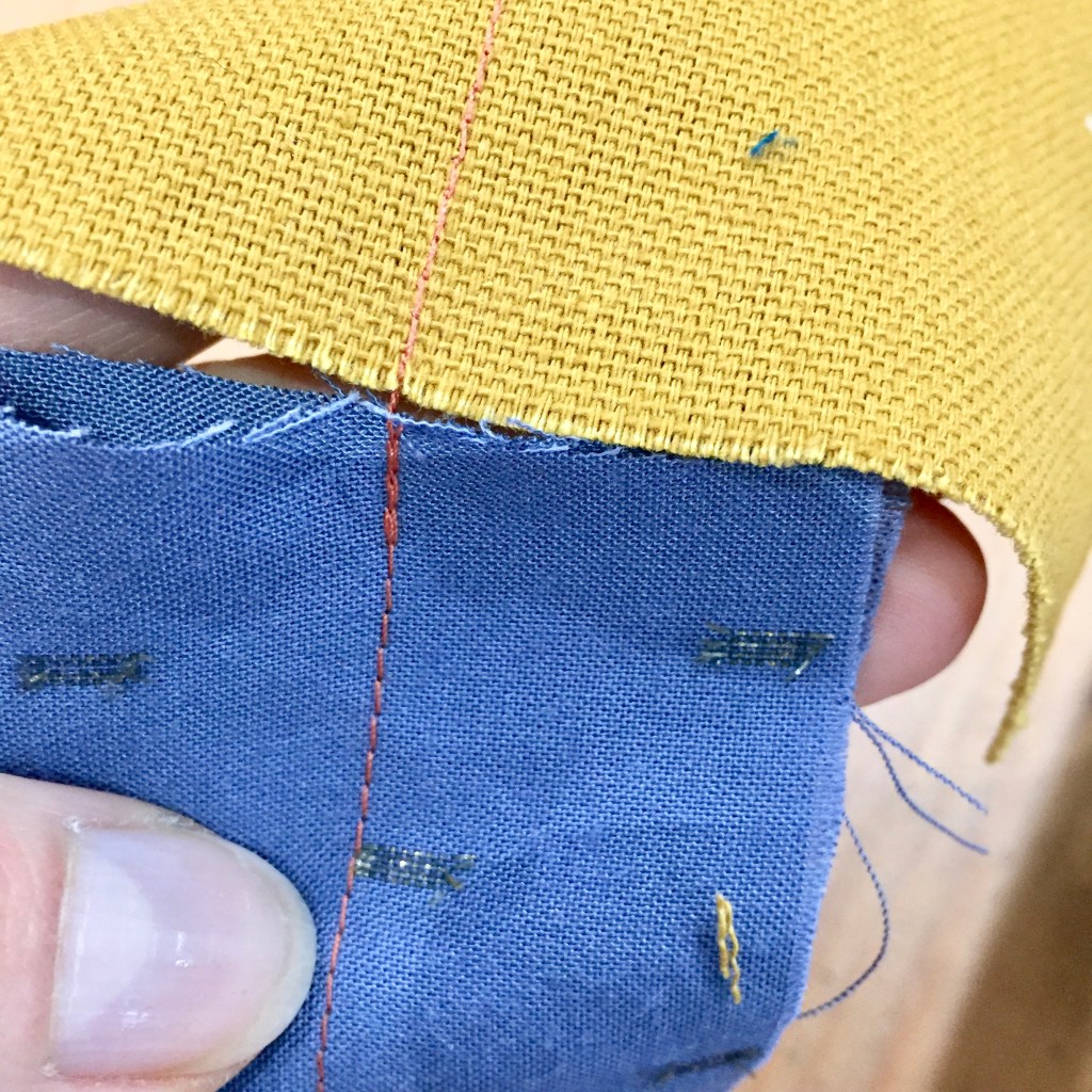 Option 1. Démarrez la couture sur un petit bout de tissu assez épais qui sera bien entrainé par votre machine. Au moment d’arriver au bord de ce tissu, mettez sous le pied de biche le bord de tissu fin bord à bord avec votre chute cousue et commencez par faire un point d’arrêt. Cette technique permet d’éviter le bourrage de tissu au début et en prime vous aurez un joli point d’arrêt sans boucles de fil.