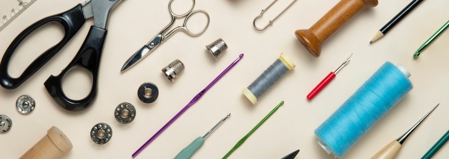 Une bonne paire des ciseaux de couture, le découd-vite, les aiguilles à main, une boite d’épingles, une craie tailleur ou craie en crayon, une règle japonaise, et un ensemble de fils basiques (blanc, noir, bleu, rouge) sont suffisants pour débuter.